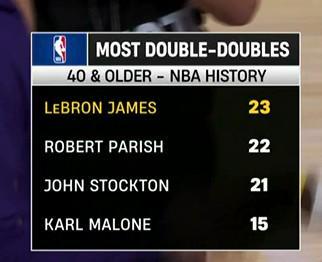 直播期间,转播方晒出了NBA历史上球员在40岁后两双次数排行榜,在这一榜单中,詹姆斯以23次位居榜首。