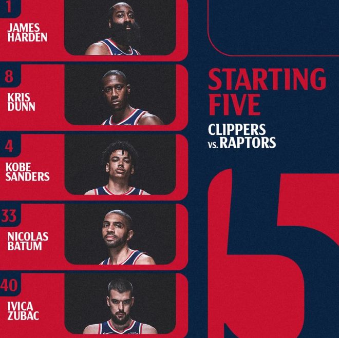 首发阵容方面,快船队这边,小琼斯、波格丹、比尔继续缺阵,保罗也还是未随队(待交易状态),伦纳德受伤病影响也不打,泰伦卢教练排出的最新首发五人组为:詹姆斯-哈登、克里斯-邓恩、桑德斯、巴图姆、祖巴茨;猛龙队这边, 巴雷特(脚踝)、珀尔特尔(背部)、沃尔特(髋部)缺战,首发阵容则为:巴恩斯、博伊尔斯、谢德、阿巴吉、英格拉姆。