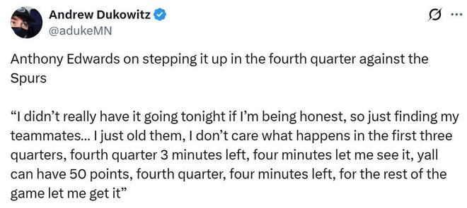 本场比赛爱德华兹也用行动证明他没有说大话,在球队半场落后25分的情况下,爱德华兹带伤出战33中19,三分16中9,爆砍生涯新高的55分,外加4板3助。