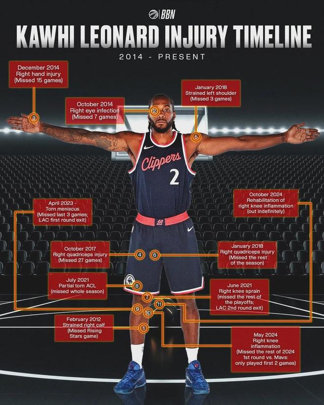 2021年7月,伦纳德遭遇右膝十字韧带撕裂;2023年4月,他又遭遇右膝盖半月板撕裂。教主搜了一下,小卡的左膝盖此前并没有大伤过,希望这次不会缺席太久。伦纳德对快船有多重要?本赛季当他缺席时,快船战绩只有3胜8负。