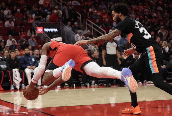 末节初段,马刺外线三分连续打铁,火箭连得4分以后,马刺暂停。但暂停以后,马刺进攻依旧哑火,谢泼德三分命中又完成抢断,电风扇篮下补篮,火箭一波9-0追到1分。但此后双方一顿打铁失误,哈珀上篮终于止血,然后双方又是一顿失误,马刺重新领先到了5分,谢泼德挺身而出,一人连得8分!帮助火箭反超比分,两队争夺白热化,文班一个不进,马刺疯狂打铁,申京勾手以后领先到了4分。谢泼德和阿门的罚球杀死比赛。