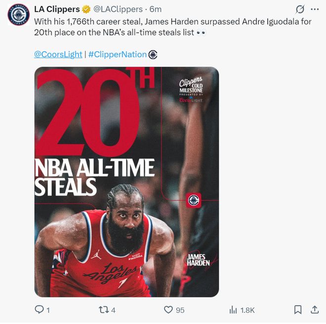 在完成个人职业生涯中的第 1766 次抢断后,詹姆斯-哈登超越了安德烈-伊戈达拉,升至 NBA 历史上最抢断榜的第 20 位。