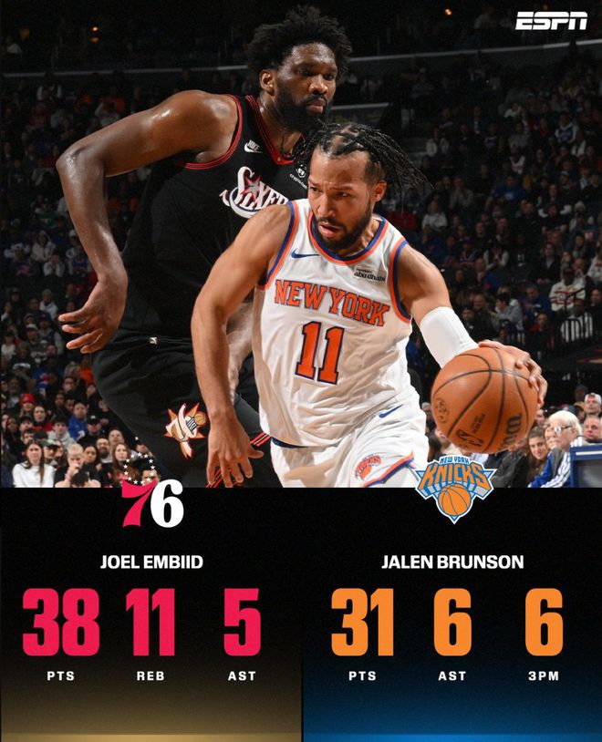 布伦森全场比赛38分钟,24中11,三分12中6,拿到31分6助攻5篮板,命中率45.8%,三分命中率50%。实际上恩比德的表现比布伦森更出色,效率也更高。