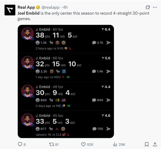 过去的四场比赛恩比德都拿到30+,他成为本赛季首位连续四场30+的中锋,过去四场恩比德场均33.3分13.3篮板5.5助攻,这就是巅峰恩比德的表现啊。