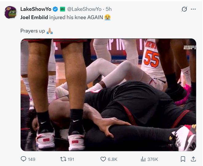 这场比赛恩比德还跟米罗有一个膝盖的碰撞,而且大帝落地时是捂着自己的左膝/左小腿附近的位置,可大帝没有大碍接着鏖战。