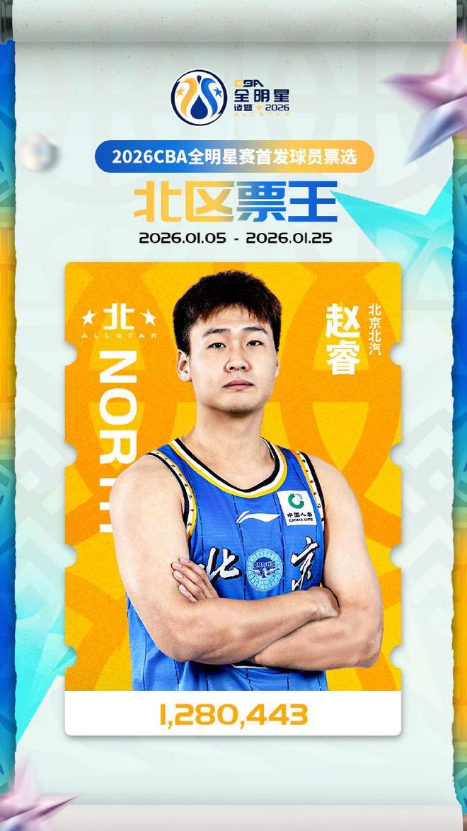 北京时间1月26日,CBA官方公布2026年全明星赛首发阵容,徐杰以1,654,042票当选南区票王,并且连续两年蝉联总票王成为历史第4人,南区首发5人分别是贺希宁、胡金秋、郭昊文、徐杰、庞峥麟;赵睿以1,280,443票当选北区票王,北区首发5人分别是曾凡博、齐麟、付豪、赵睿、廖三宁。