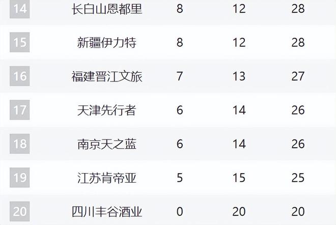 14-20分别是吉林、新疆、福建、天津、同曦、江苏和四川。吉林、福建和新疆这轮全部都输球了,特别是新疆好不容易崛起,这轮却最后时刻崩盘输给同曦。至于吉林和福建,相比于赛季初期,他们的排名还在持续下滑。天津现在已经三连败,同曦即便这轮取胜,但他们目前也就6胜,他们的状态需要巩固住。江苏最近状态非常好,10场赢了4场,可惜这轮输给了浙江。四川已经20连败。