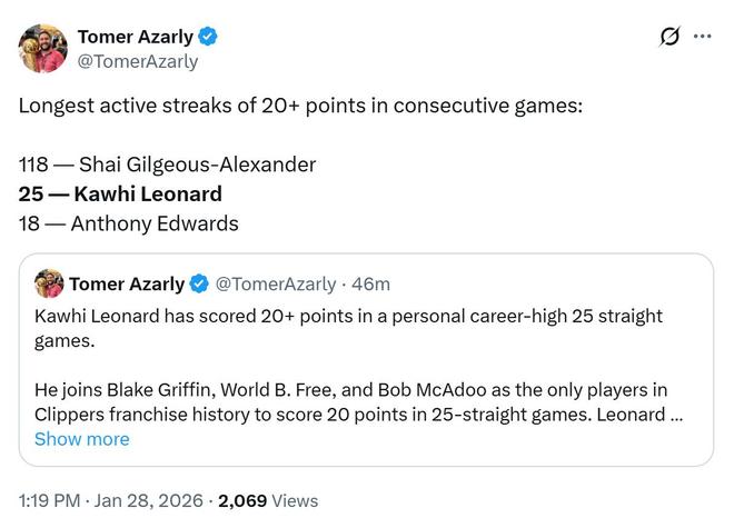需要关注的是,伦纳德还创下了NBA第2的神迹。伦纳德已经连续25场得分20+,NBA联盟现存第二长纪录。亚历山大以连续118场高居第1,安东尼爱德华兹(18场)排名第3。