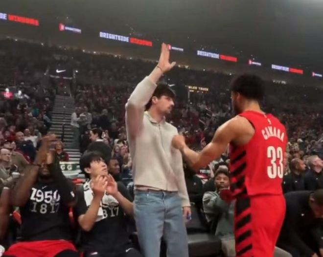 开拓者主场球迷鼓掌祝贺阿夫迪亚首次入选全明星,阿夫迪亚起立致谢,杨瀚森在一旁鼓掌祝贺。