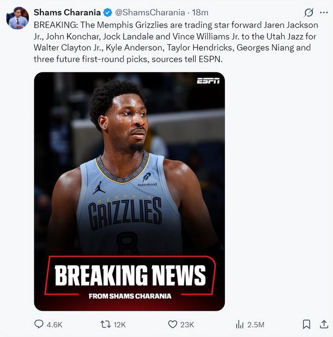 北京时间2月4日凌晨,根据ESPN记者Shams的报道,爵士队与灰熊队达成交易,小贾伦-杰克逊将被交易到爵士队换取三个首轮签。