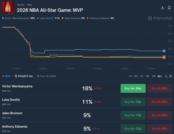 在全明星正赛前,文班亚马的AMVP概率是最高的,爱德华兹只有9%,最终他却带队夺冠拿到了AMVP。