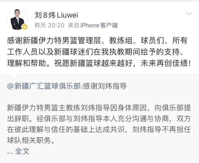 2月13日,新疆广汇篮球俱乐部通过微博发布公告,称主教练刘炜因身体原因辞职,不再担任球队相关职务。