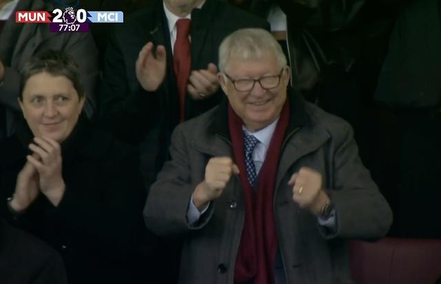 乐坏了,曼联2-0领先后弗爵爷在看台握拳庆祝