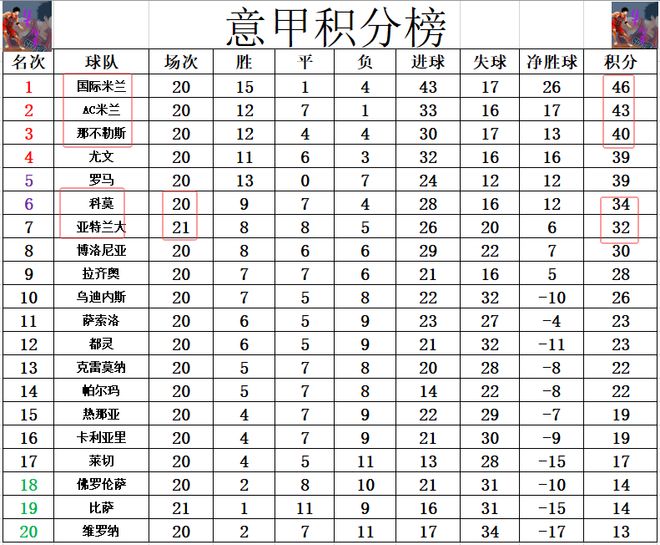 积分榜方面,国米和AC米兰本周中补赛都赢了球,国米还是3分优势力压AC米兰领跑,那不勒斯补赛无力赢球被拉开差距,落后国米6分,少AC米兰3分排在第3。亚特兰大今天要是能赢球夺得4连胜的话,就能追上黑马科莫,只是他们最后惨遭绝平,3连胜被终止,差科莫2分暂时还是排在第7。