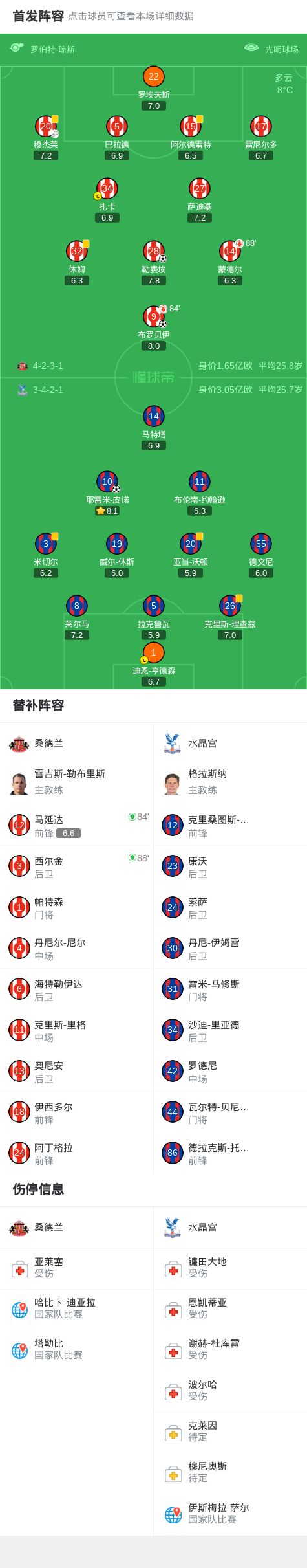 桑德兰2-1水晶宫,勒费埃建功,布罗贝伊制胜