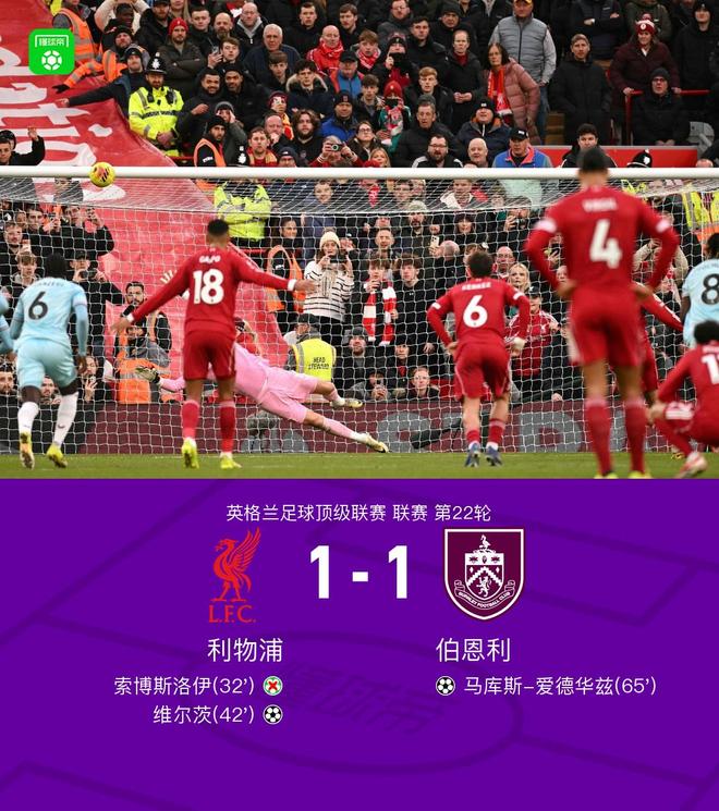 北京时间1月17日,英格兰足球顶级联赛第22轮,利物浦主场对阵伯恩利。比赛中,加克波造点,索博斯洛伊主罚点球击中横梁,维尔茨乱战破门,马库斯-爱德华兹扳平比分。最终,双方1-1战平。