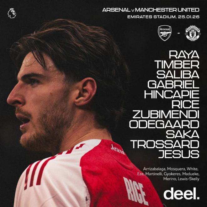 替补:13-凯帕、3-克里斯蒂安-莫斯克拉、4-本-怀特、10-埃泽、11-马丁内利、14-哲凯赖什、20-马杜埃凯、23-梅里诺、49-刘易斯-斯凯利