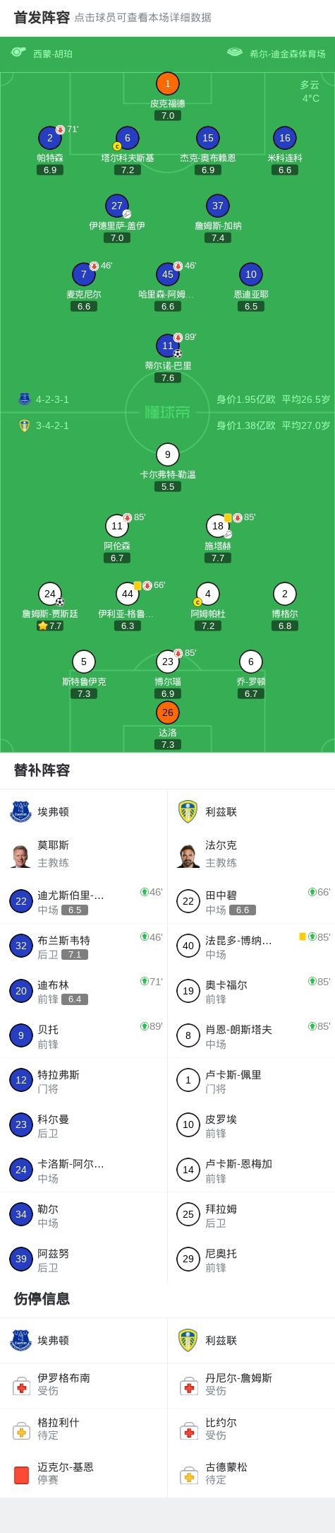 第28分钟,詹姆斯-贾斯廷禁区推射破门,利兹联1-0埃弗顿