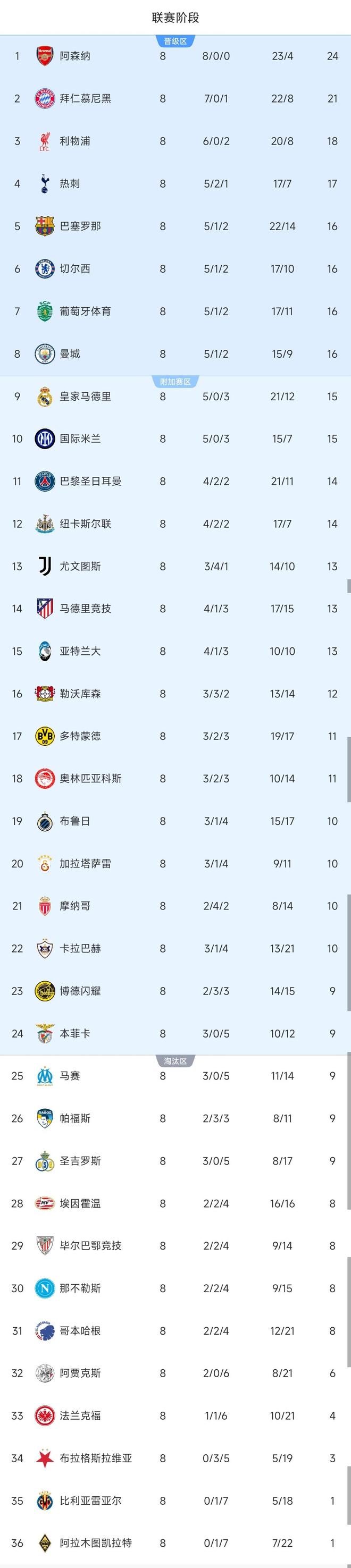 英超球队展现了强大的整体实力,阿森纳以全胜战绩高居榜首,利物浦、托特纳姆热刺、切尔西和曼城也均位列前八,从而直接晋级。