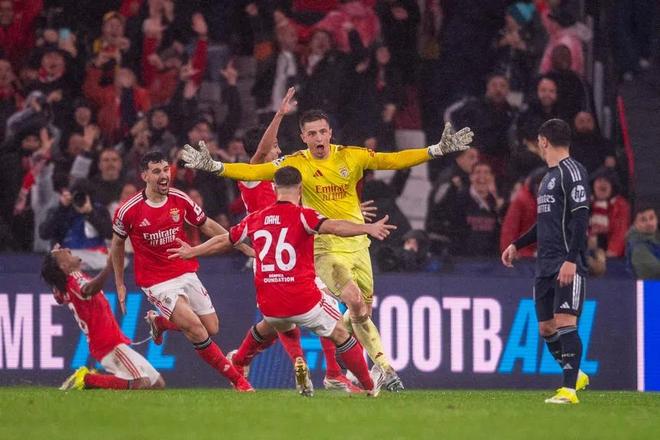 在伤停补时第8分钟,本菲卡门将特鲁宾插入皇马禁区跃起进球,帮助球队晋级欧冠淘汰赛附加赛。